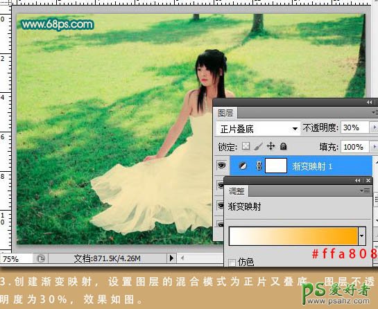 3、创建渐变映射调整图层,设置图层混合模式改为“正片叠底”,图层不透明度设为:30%,效果如下图。
