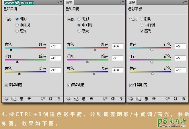 4、创建色彩平衡调整图层,对阴影,中间调,高光进行调整,参数设置如下图。
