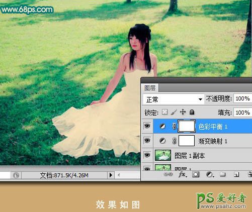 photoshop给草地上漂亮的美女婚纱照调出浪漫的黄青色