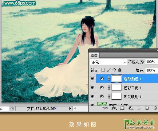 photoshop给草地上漂亮的美女婚纱照调出浪漫的黄青色
