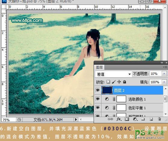 6、新建一个图层,填充颜色:#03004c,图层混合模式改为“差值”,不透明度改为:10%,效果如下图。