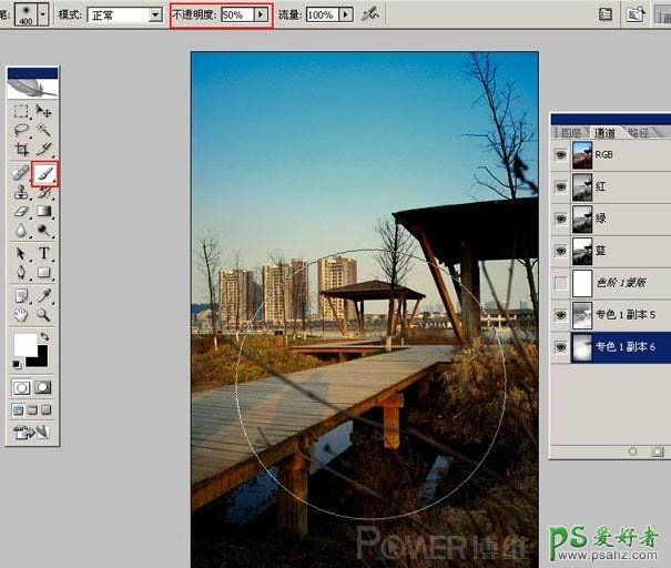 11、发现木桥部分太暗,层次不强, 选择画笔工具(笔头在一点),前景色为白色,不透明度50,在桥面部分擦拭。