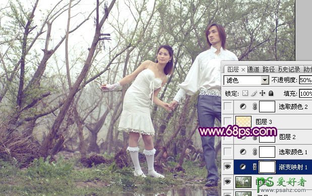 2、创建渐变映射调整图层,颜色设置如图2,确定后把图层混合模式改为“滤色”,不透明度改为:50%,效果如图3。>