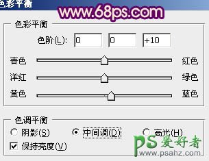 10、创建色彩平衡调整图层,对中间调进行调整,参数设置如图17,效果如图18。>