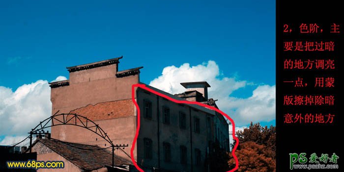 2、创建色阶调整图层,稍微调亮一点,数值自定。确定后用黑色画笔把下图红圈以外的部分擦出来。