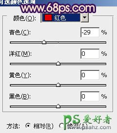 9、创建可选颜色调整图层,对红,黄进行调整,参数设置如图12,13,效果如图14。