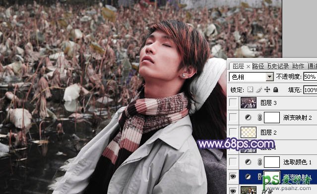 1、打开原图素材,创建渐变映射调整图层,颜色设置如图1,确定后把图层混合模式改为“色相”,不透明度改为:50%,效果如图2。