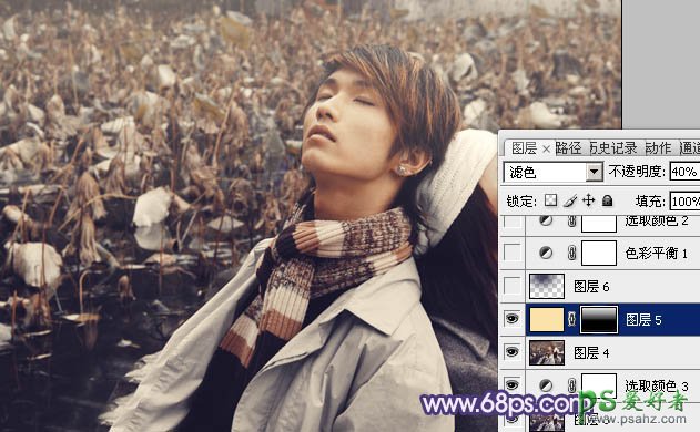 7、新建一个图层,填充颜色:#F9E3A8,混合模式改为“滤色”,不透明度改为:40%,加上图层蒙版,用黑白渐变拉出底部透明的线性渐变,如下图。
