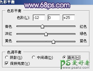9、创建色彩平衡调整图层,对高光进行调整,参数设置如图15,效果如图16。