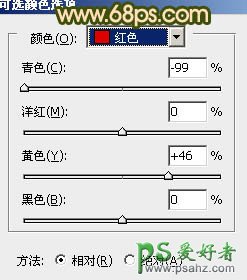 4、创建可选颜色调整图层,对红,黄进行调整,参数设置如图6,7,效果如图8。