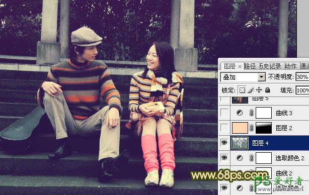 7、按Ctrl + Alt + ~ 调出高光选区,按Ctrl + Shift + I 反选,新建一个图层填充颜色:#07554D,混合模式改为“叠加”,不透明度改为:30%,效果如下图。