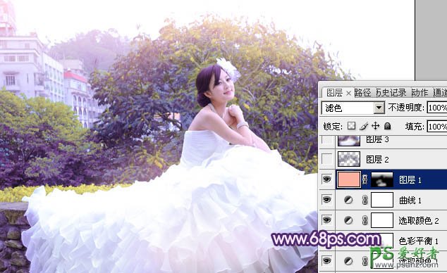 6、按Ctrl + Alt + ~ 调出高光选区,按Ctrl + Shift + I 反选。新建一个图层填充颜色:#351662,混合模式改为“滤色”,不透明度改为:30%,效果如下图。