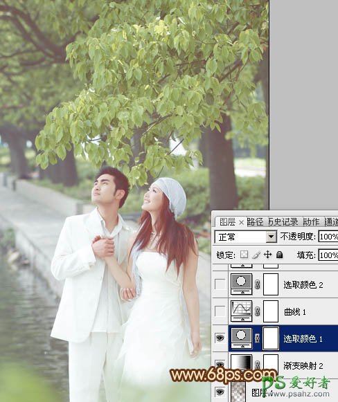 PS影楼婚片后期调色教程:给树林里的情侣婚片调出黄色艺术效果