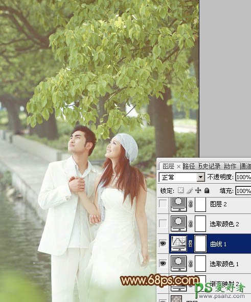 PS影楼婚片后期调色教程:给树林里的情侣婚片调出黄色艺术效果