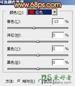 6、创建可选颜色调整图层,对红,黄进行调整,参数设置如图12,13,确定后按Ctrl + J 把当前可选颜色调整图层复制一层,不透明度改为:30%,效果如图14。
