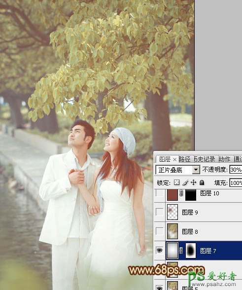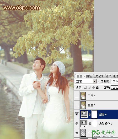 PS影楼婚片后期调色教程:给树林里的情侣婚片调出黄色艺术效果