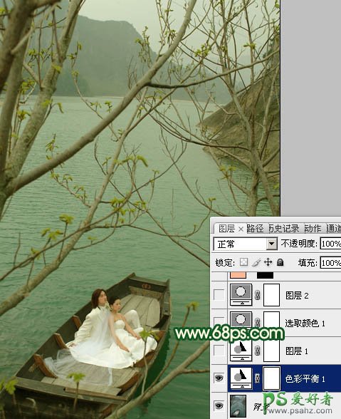 今天我们来学习一篇PS婚片后期调色实例教程,photoshop调出烂漫的春季湖水上的情侣婚纱写真照,原图素材的意境非常不错,有江水和刚发芽的树枝,春季意味浓厚。不过还不过有气势,处理的时候简单把江水等调成翠绿色,顶部再渲染一些阳光等,画面会