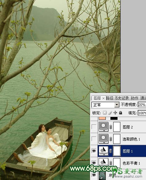 photoshop调出烂漫的春季湖水上的情侣婚纱写真照