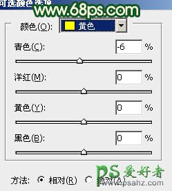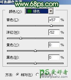 3、创建可选颜色调整图层,对黄,绿进行调整,参数设置如图5,6,效果如图7。