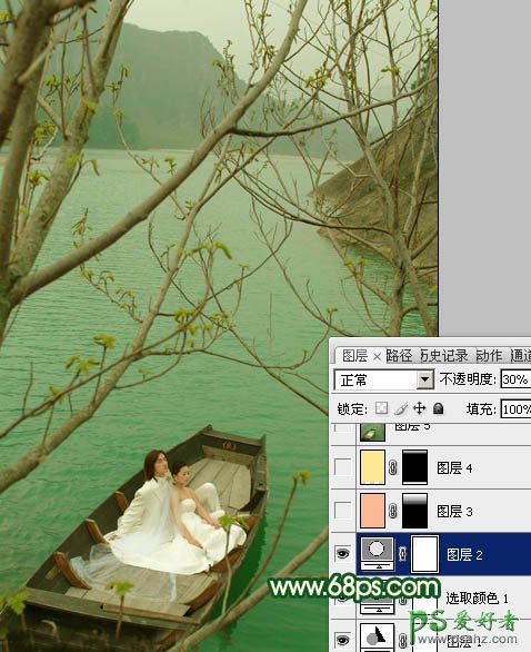 photoshop调出烂漫的春季湖水上的情侣婚纱写真照