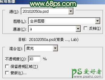 9、新建一个图层,盖印图层。选择菜单:图像 > 模式 > Lab颜色,选择不合拼。然后执行:图像 > 应用图像,参数设置如图14,效果如图15。