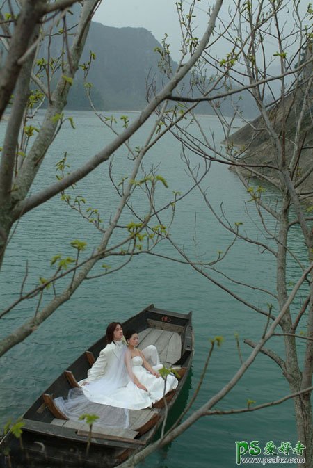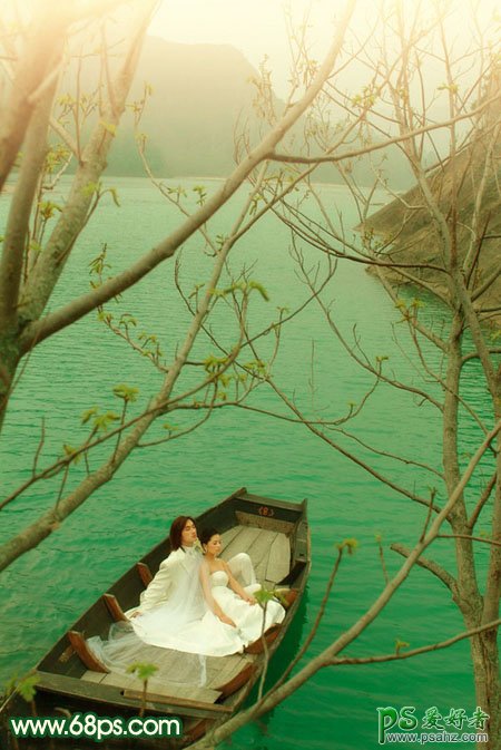 今天我们来学习一篇PS婚片后期调色实例教程,photoshop调出烂漫的春季湖水上的情侣婚纱写真照,原图素材的意境非常不错,有江水和刚发芽的树枝,春季意味浓厚。不过还不过有气势,处理的时候简单把江水等调成翠绿色,顶部再渲染一些阳光等,画面会更有生气。