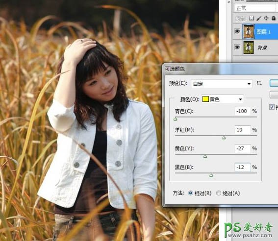4、弹出可选颜色对话框,在颜色里面选择黄色,调整数值,如图。