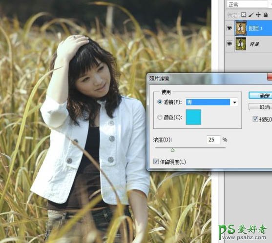 7、弹出照片滤镜对话框,选择青色,参数数值如图。