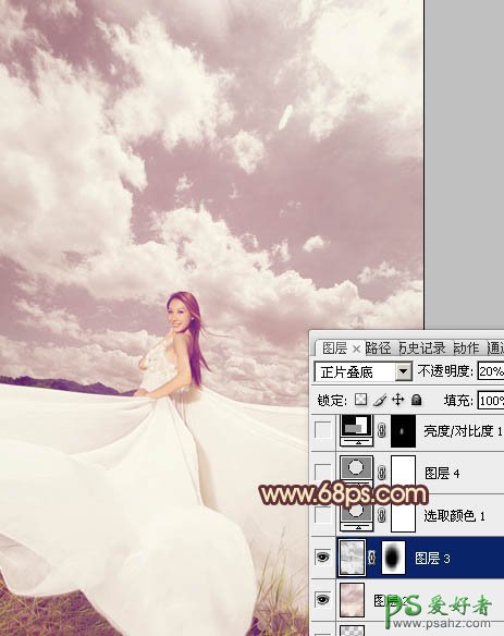 6、新建一个图层,盖印图层。按Ctrl + Shift + U 去色,混合模式改为“正片叠底”,不透明度改为:20%,加上图层蒙版,用黑色画笔把中间部分擦出来,效果如下图。
