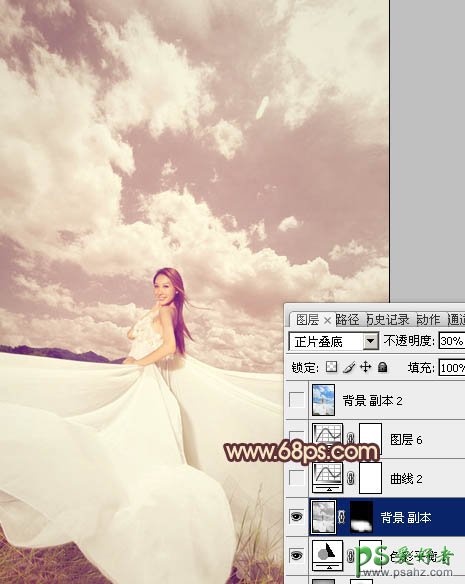 11、把背景图层复制一层,按Ctrl + Shift + ] 置顶,按Ctrl + Shift + U 去色,再把混合模式改为“正片叠底”,按住Alt 键添加图层蒙版,用白色画笔把人物裙子部分擦出来,适当降低图层不透明度,这一步主要是增强衣服部分的细节,效果如下图。