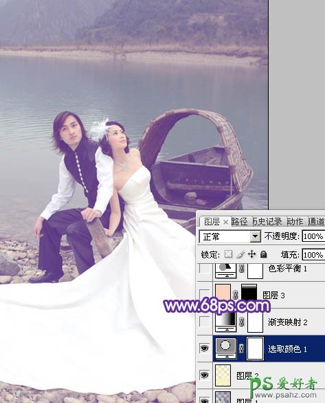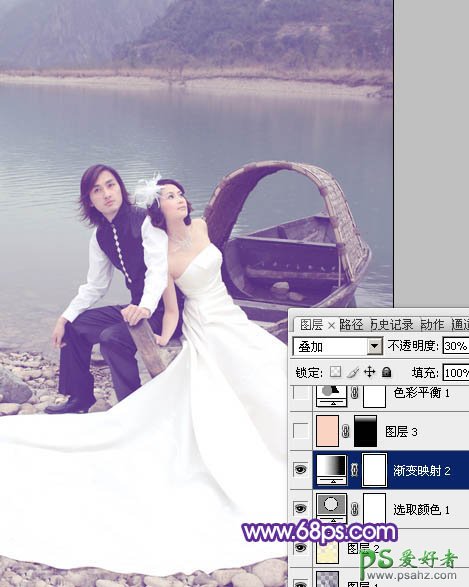photoshop给水边小船上的情侣婚片调出纯美的蓝紫色