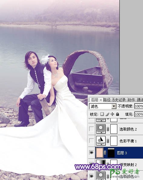6、新建一个图层,填充颜色:#F9D3C2,混合模式改为“滤色”,加上图蒙版,只保留顶部,其它部分用黑色画笔擦掉,效果如下图。