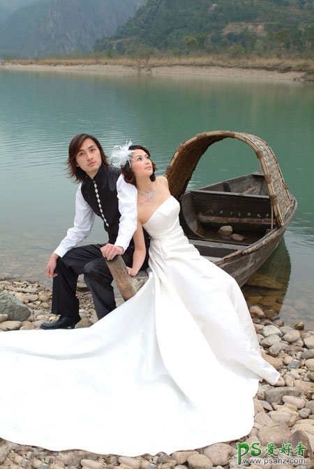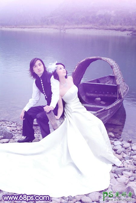 这里我们教大家学习一篇PS婚片后期调色实例教程,photoshop给水边小船上的情侣婚片调出纯美的蓝紫色,蓝紫色是比较干净的色彩,应用也比较广泛。调色的时候先不要太心急,需要把画面中各个局部的颜色慢慢转化为想要的主色,然后再渲染好高光,美化好细节等即可。