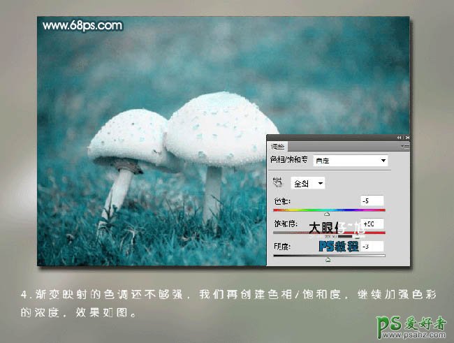4、渐变映射的色调还不够强,我们再创建色相/饱和度调整图层,对全图进行调整,参数设置如下图,加强色彩的浓度。
