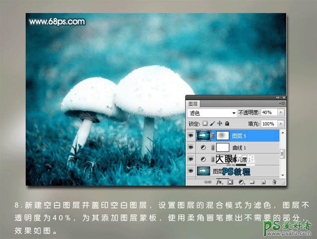 8、新建一个图层,盖印图层。混合模式改为“滤色”,图层不透明度改为:40%,添加图层蒙版,用黑色柔角画笔擦去不需要的部分,效果如下图。