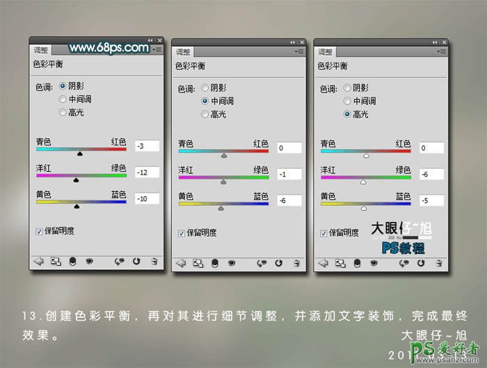 13、创建色彩平衡调整图层,对阴影,中间调,高光进行调整,参数设置如下图。