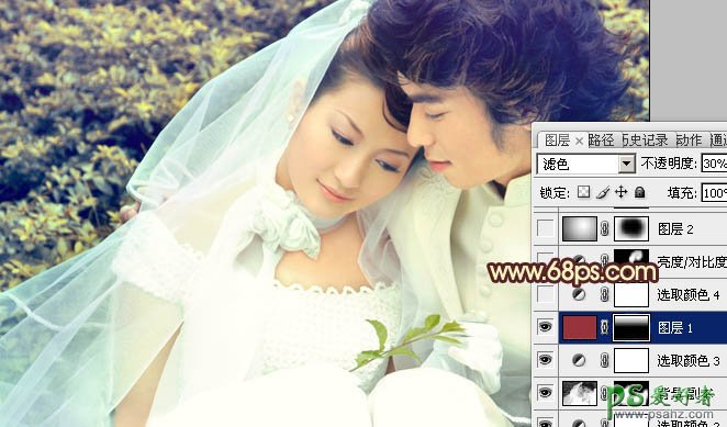 9、新建一个图层,填充暗红色,图层混合模式改为“滤色”,不透明度改为:30%,加上图层蒙版,用黑白线性渐变拉出底部透明效果,如下图。