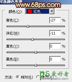 10、创建可选颜色调整图层,对红,黄进行调整,参数设置如图22,23,效果如图24。