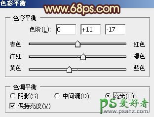 4、创建色彩平衡调整图层,对高光进行调整,参数设置如图9,确定后只保留人物部分,其它部分用黑色画笔擦掉,效果如图10。