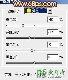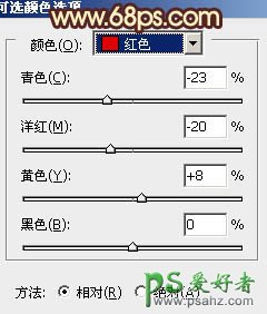 6、创建可选颜色调整图层,对红,黄进行调整,参数设置如图14,15,效果如图16。
