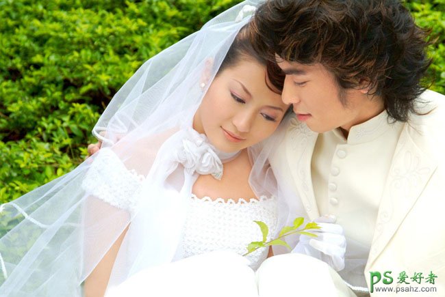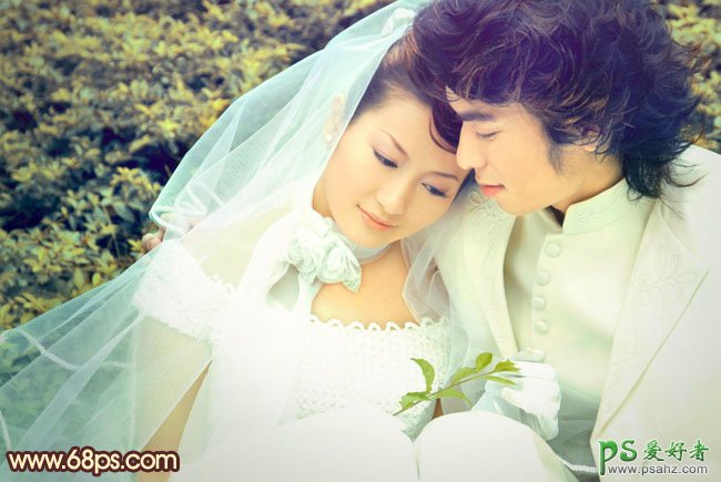 PS婚片后期调色实例教程,photoshop给一对爱人婚纱照调出黄绿蜜糖色,外景图片较快的调色方法就是把背景与人物分开来调色,可以随意按照自己的喜欢选择主色。然后再慢慢改变局部色彩。虽然是分开调色,但要注意好整体效果的统一。