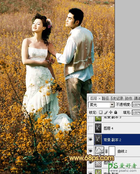 10、把背景图层复制一层,按Ctrl + Shift + ] 置顶,按Ctrl + Shift + U 去色,按Ctrl + M 压暗,效果如图19。然后把图层混合模式改为“柔光”,效果如图20。这一步把图片整体调暗。