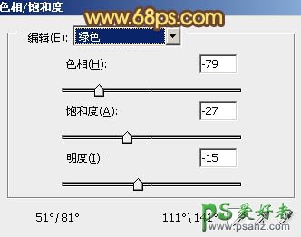 1、打开原图素材,创建色相/饱和度调整图层,选择绿色,用吸管吸取背景绿色部分再调整,参数设置如图1,效果如图2。这步调出大致的主色,后面还需要慢慢修饰。