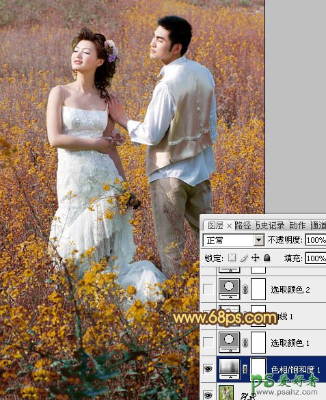PS调色教程:给油菜花地里的情侣婚片调出金色效果