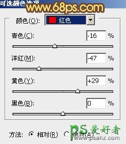 2、创建可选颜色调整图层,对红色进行调整,参数设置如图3,效果如图4。这一步把红色转为橙黄色。