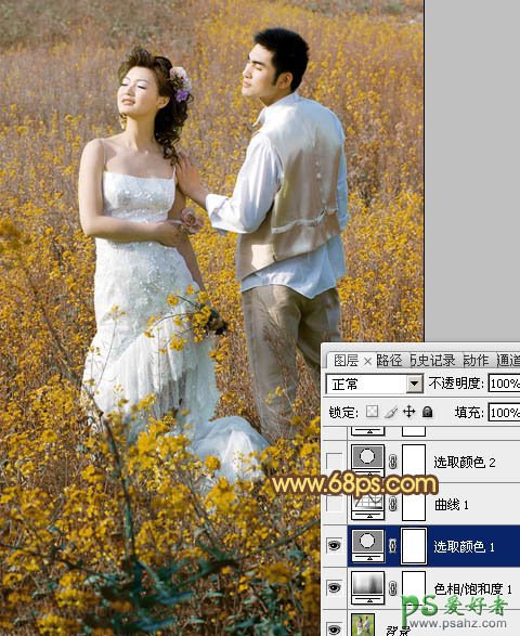 PS调色教程:给油菜花地里的情侣婚片调出金色效果