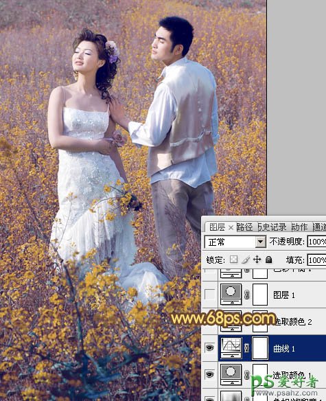 PS调色教程:给油菜花地里的情侣婚片调出金色效果