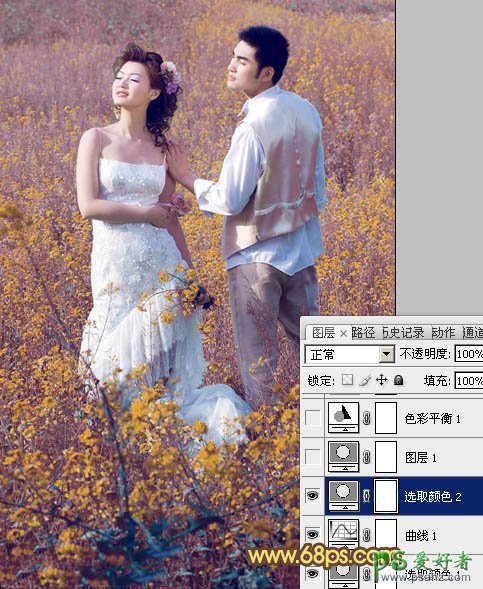 PS调色教程:给油菜花地里的情侣婚片调出金色效果