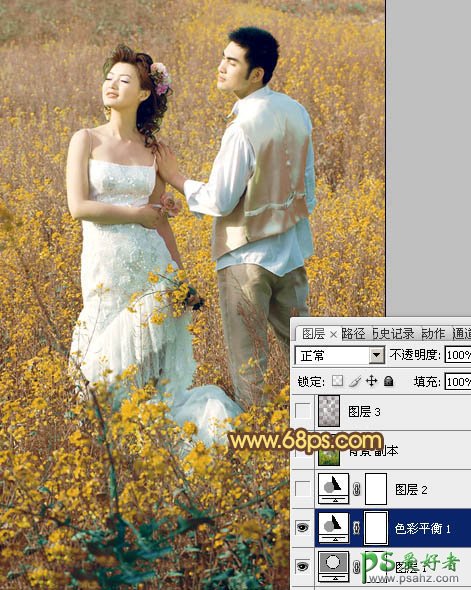 PS调色教程:给油菜花地里的情侣婚片调出金色效果