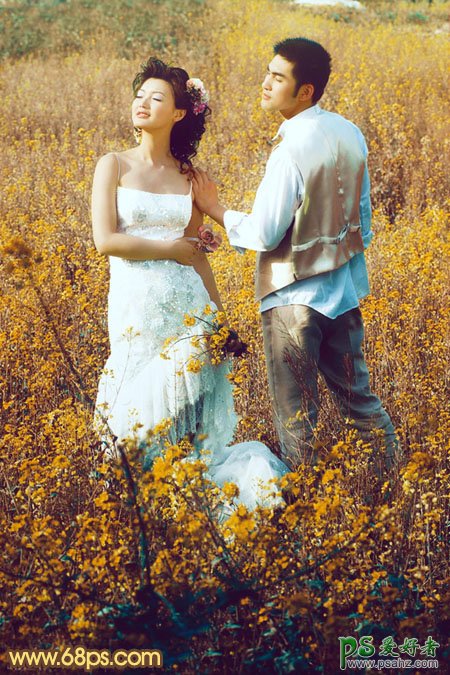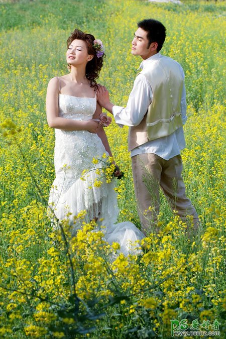 今天我们来学习一篇PS照片后期调色实例教程,PS调色教程:给油菜花地里的情侣婚片调出金色效果,金色是种比较容易调整的颜色,不过这种颜色比较鲜丽,调好后还需要把图片整体调暗并适当柔化处理,来增强画面的层次感。局部可以按照自己的喜爱增加一些补色。